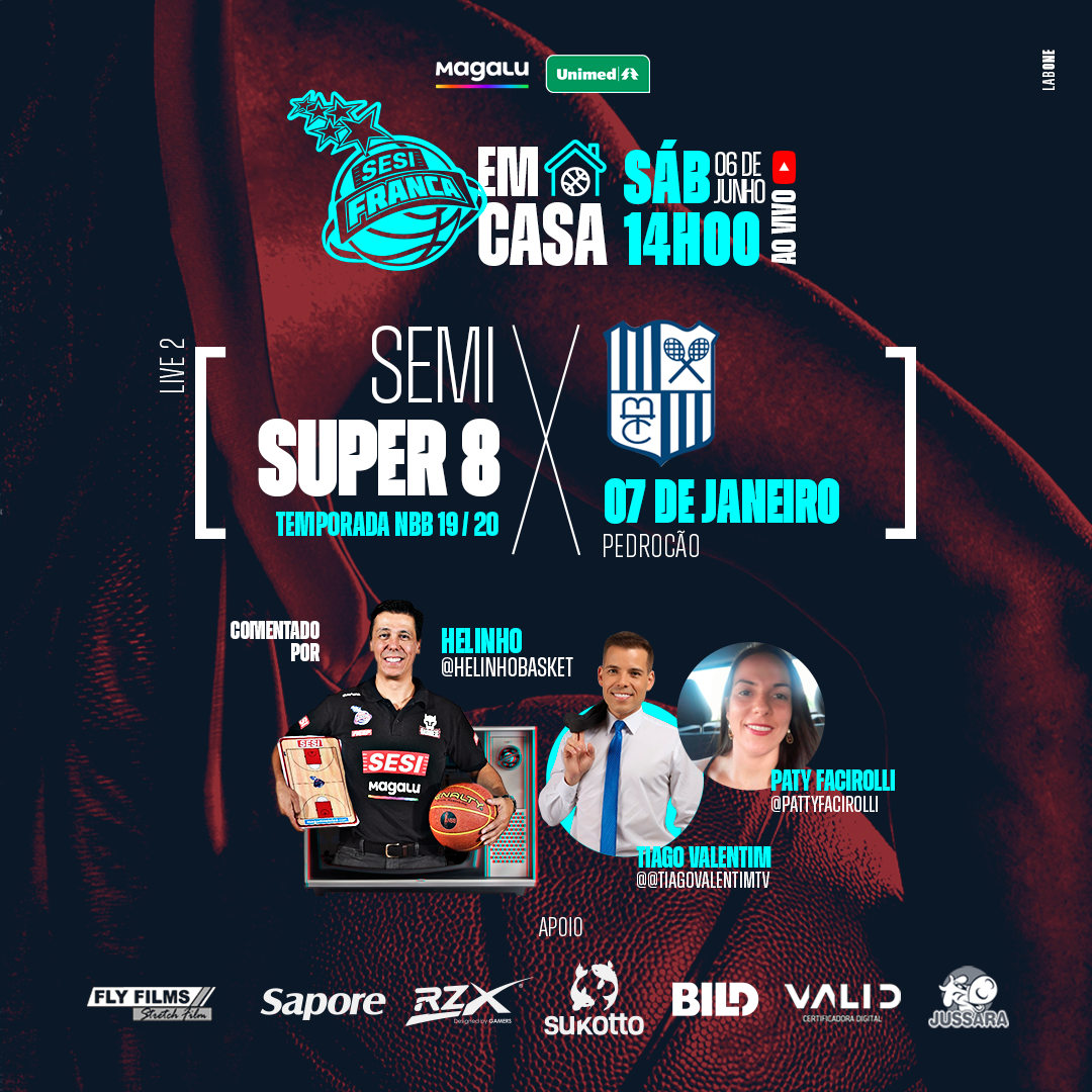 Após o sucesso da primeira live, o Sesi Franca Basquete dá sequência ao projeto “Em Casa”, que tem como objetivo reprisar jogos emocionantes da equipe durante toda a sua vitoriosa história. Neste sábado (06 de junho), às 14h (de Brasília), a partida da vez será a semifinal da Copa Super 8, diante do Minas Tênis Clube, que foi disputada no ginásio Municipal Pedro Murilla Fuentes (Pedrocão), em Franca (SP), ao lado da torcida francana, no início desse ano, em 07 de janeiro.